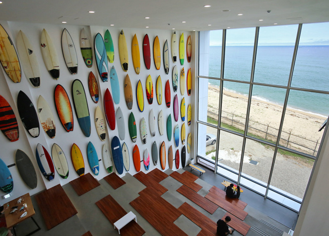 카페 내부에 서핑보드가 엄청 많이 진열되어 있어요.