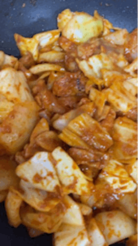 1. 팬 위에 닭갈비의 껍질 부분이 바닥으로 향하도록 놓는다.