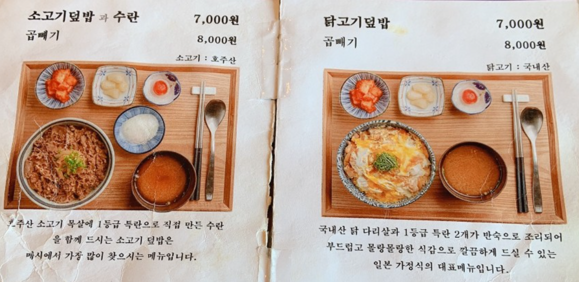 메뉴: 연어 한 마리 덮밥, 소고기덮밥, 닭고기 덮밥 등