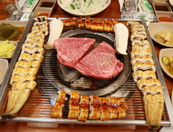 참숯으로 한우와 장어를 같이 구워먹을 수 있어요.