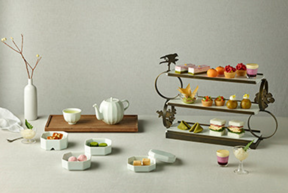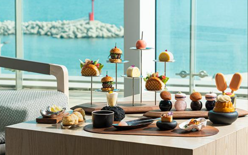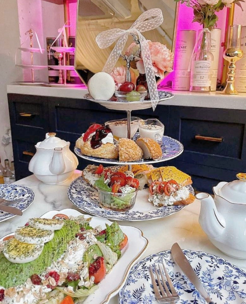 여덟 종류의 스위트 디저트, 여섯 종류의 세이보리, 두 잔의 차 또는 커피
